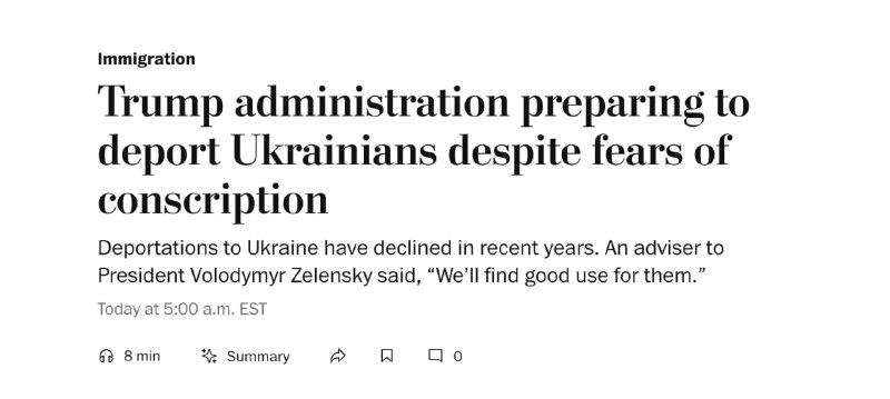‼️Трамп готується до масштабної депортації українців назад до України, — The Washington Post Посол України в США Стефанішина повідомила, що рішення про висилку ухвалили через порушення американського законодавства. За даними видання, частині українців уже заявили, що їх можуть відправити військовими рейсами до України або Польщі.