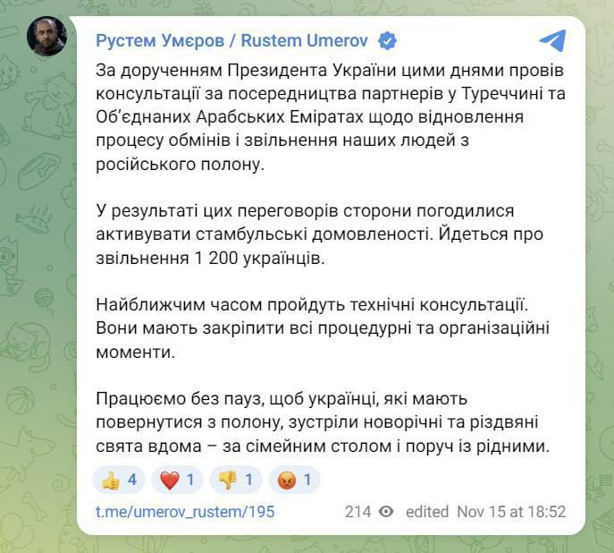 🙏 Україна поверне з полону 1200 українських військових, — секретар РНБО Умєров після перемовин з представниками ОАЕ та Туреччини Найближчим часом пройдуть технічні консультації. Вони мають закріпити всі процедурні та організаційні моменти. 2025-11-15T17:51:28+00:00 View Source Доєднайся на Telegram канал https://t.me/golostoday Навігація записів Завтра у більшості регіонів будуть відключення електроенергії з 00:00 до 23:59 … РФ намагатиметься до зими закріпитися у Покровську та Мирнограді, бо з приходом …