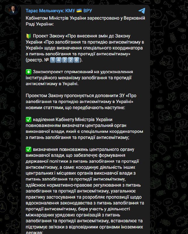 👀❗️Кабмін пропонує призначити «спеціального координатора з питань запобігання та протидії антисемітизму», — урядовий представник у ВР Мельничук